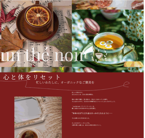 コンセプト:働く女性がほっと一息つける時間のお供になる紅茶専門店の通販サイト(架空の店舗設定はすべて清水が作成)
